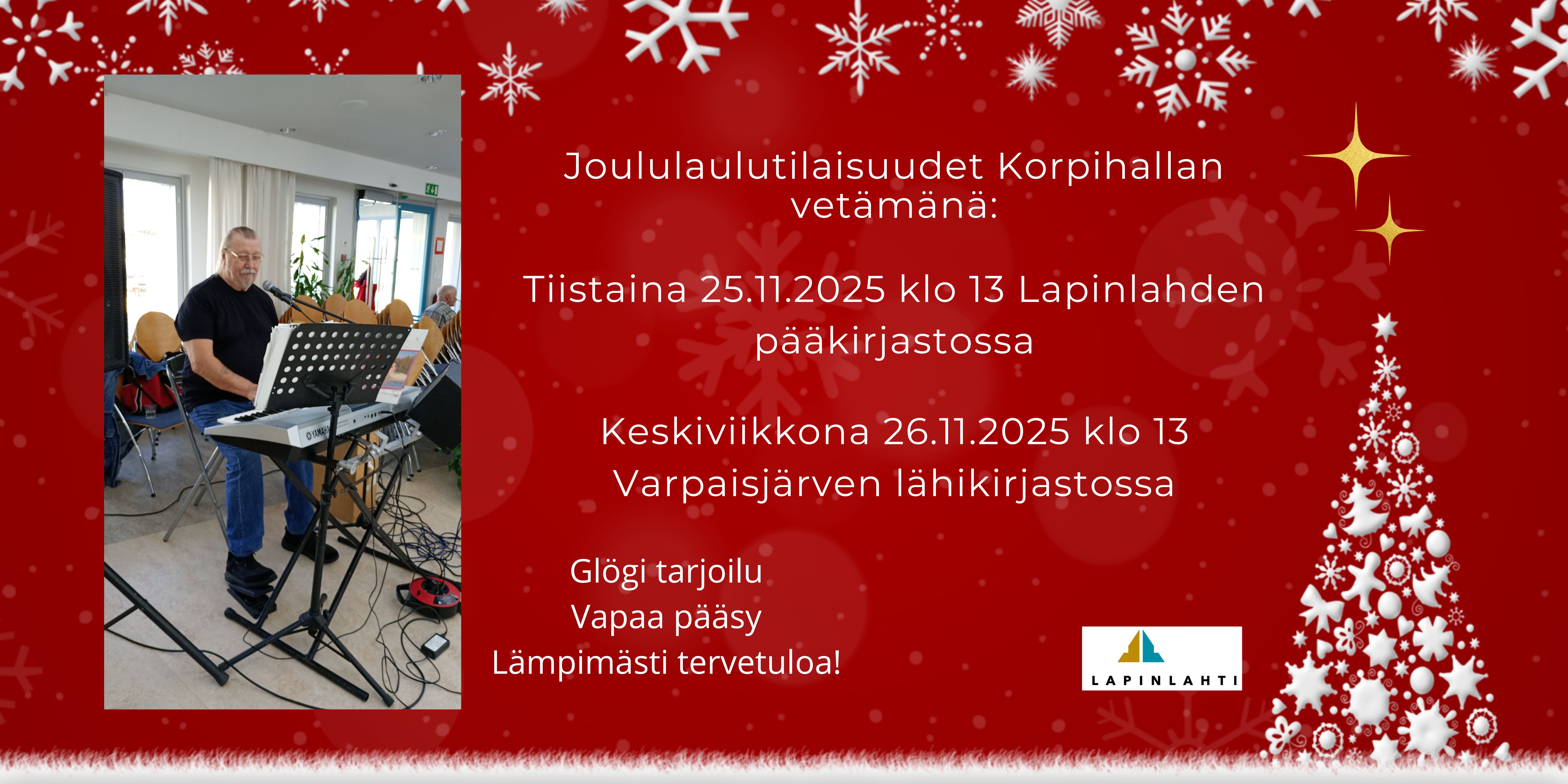 Korpihallan vetämänä joululaulutilaisuudet Lapinlahden pääkirjastossa tiistaina 25.11.2025 klo 13 ja Varpaisjärven lähikirjastossa keskiviikkona 26.11.2025 klo 13.