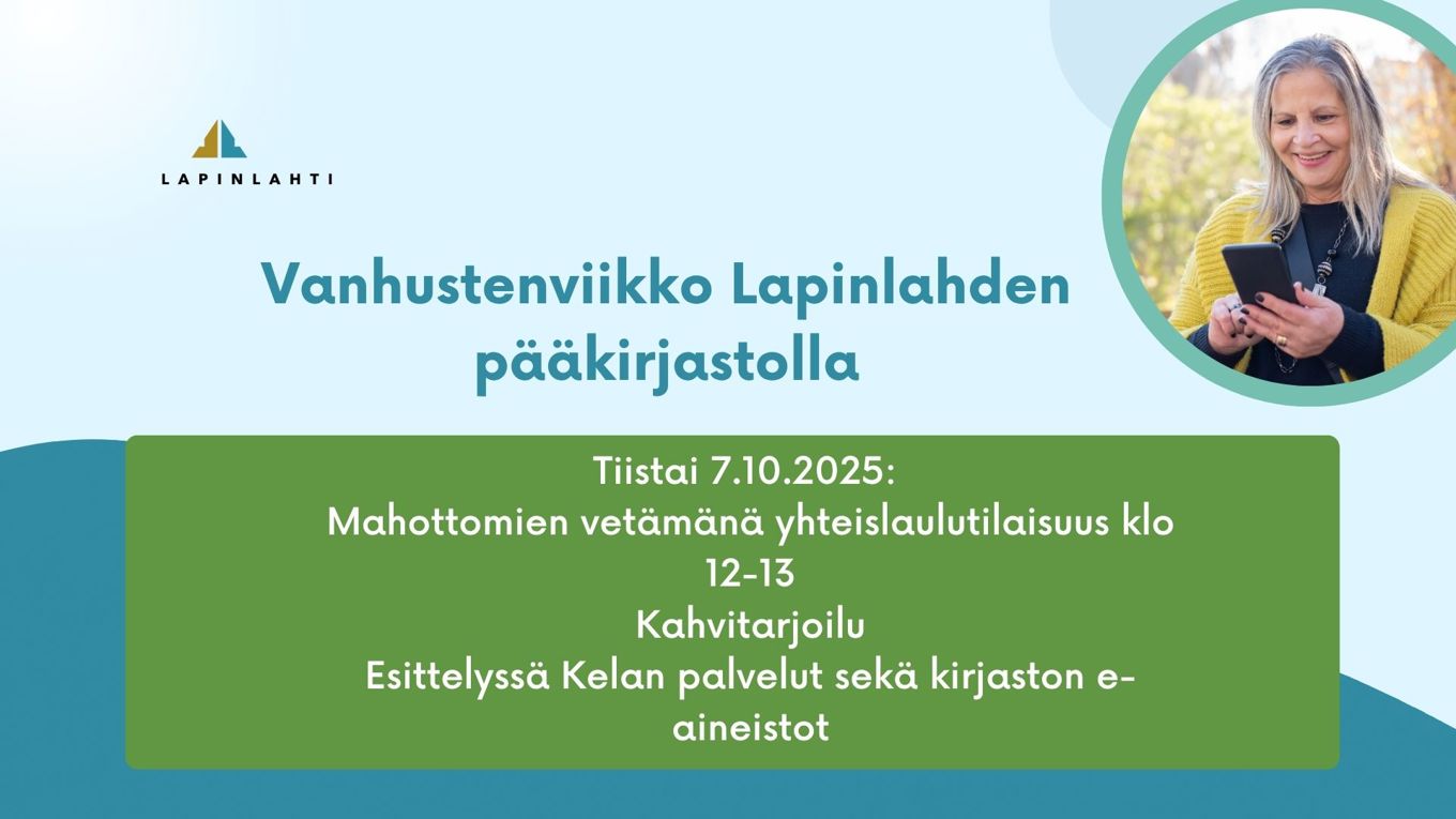 Valtakunnallinen vanhustenviikko on 5.10.- 12.10.2025. Lapinlahden pääkirjastolla vanhustenviikolla tiistaina 7.10.2025 järjestetään klo 12-13 Mahottomien vetämänä yhteislaulutilaisuus. Teemana laulutilaisuudessa on: Savolaiset hyvän mielen kupletit.